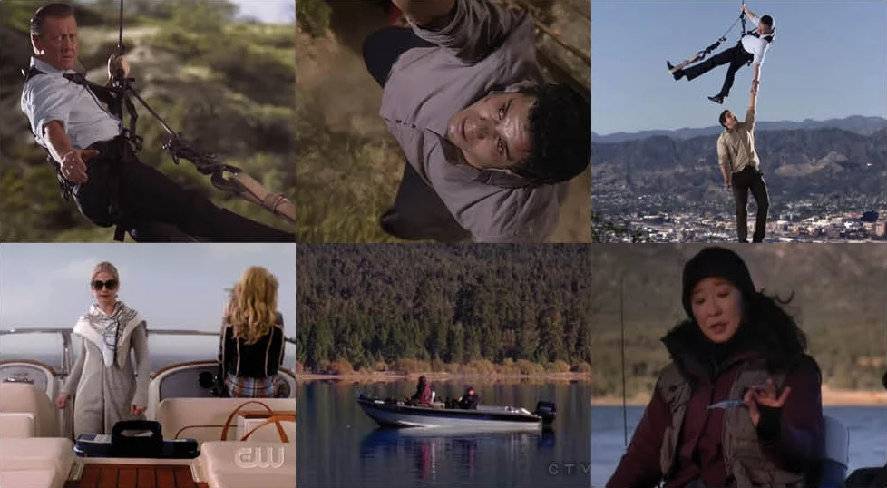 I suppose I can comfort you in the fact that you're not alone in the land of questionable lighting and perspective. The short-lived series, Ringer, staring Sarah Michelle Geller, had a bumpy start from the pilot. The only thing the boat scene at the ten minute mark ensured was an open hour in my weekly TV schedule. It's clear boat scenes present innumerable challenges, even Grey's Anatomy fell prey. In this scene from season seven, the wide shots are on a pristinely glassy lake. However, the closeups are on choppy water with wind whipping through Christina's hair. So there you go, Scorpion, you're not alone, but you can do better.