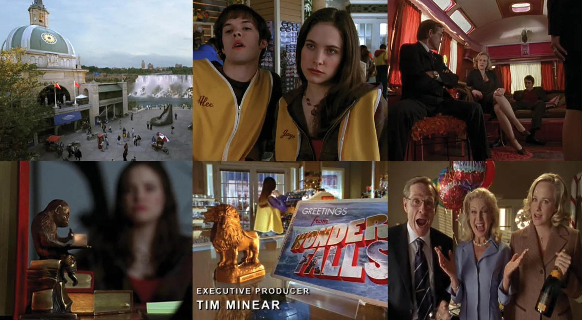 Jaye's angst is a nice contrast to the 'Honeymoon Capital of the World.' I knew the pilot had me, when Jaye told a little kid to, 'piss off' Ha! The quirky innocence of this place seems to do nothing but antagonize Jaye's resistance to engage with fellow townspeople, until the objects including a misshapen wax lion, a brass monkey bookend, a pink lawn flamingo, a cow creamer and many, many others all start talking to her. The series plays on the Honeymoon reputation and well as building on the mythology of Niagara Falls, from Indian ceremonies to barreling down the falls, captured in the main title theme song, 'I Wonder Why the Wonder Falls,'  written and performed by Andy Partridge. Props to Michael Andrews who also did the score to Donnie Darko and Music Supervisor Julie Houlihan who helped secure many tracks including the final track, Travis' 'Love Will Come Through.'