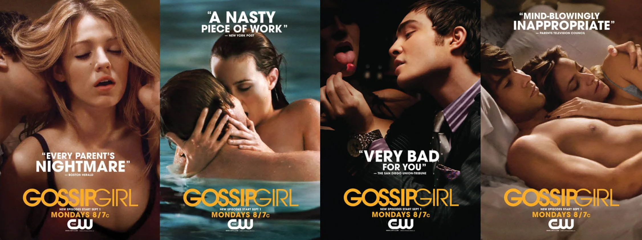 Also of note, are the Gossip Girl season two TV promos which employed the same venomous headlines. All are here on this link. The last two are just magic, using the track, Ca Plane Pour Moi by Plastic Bertrand.